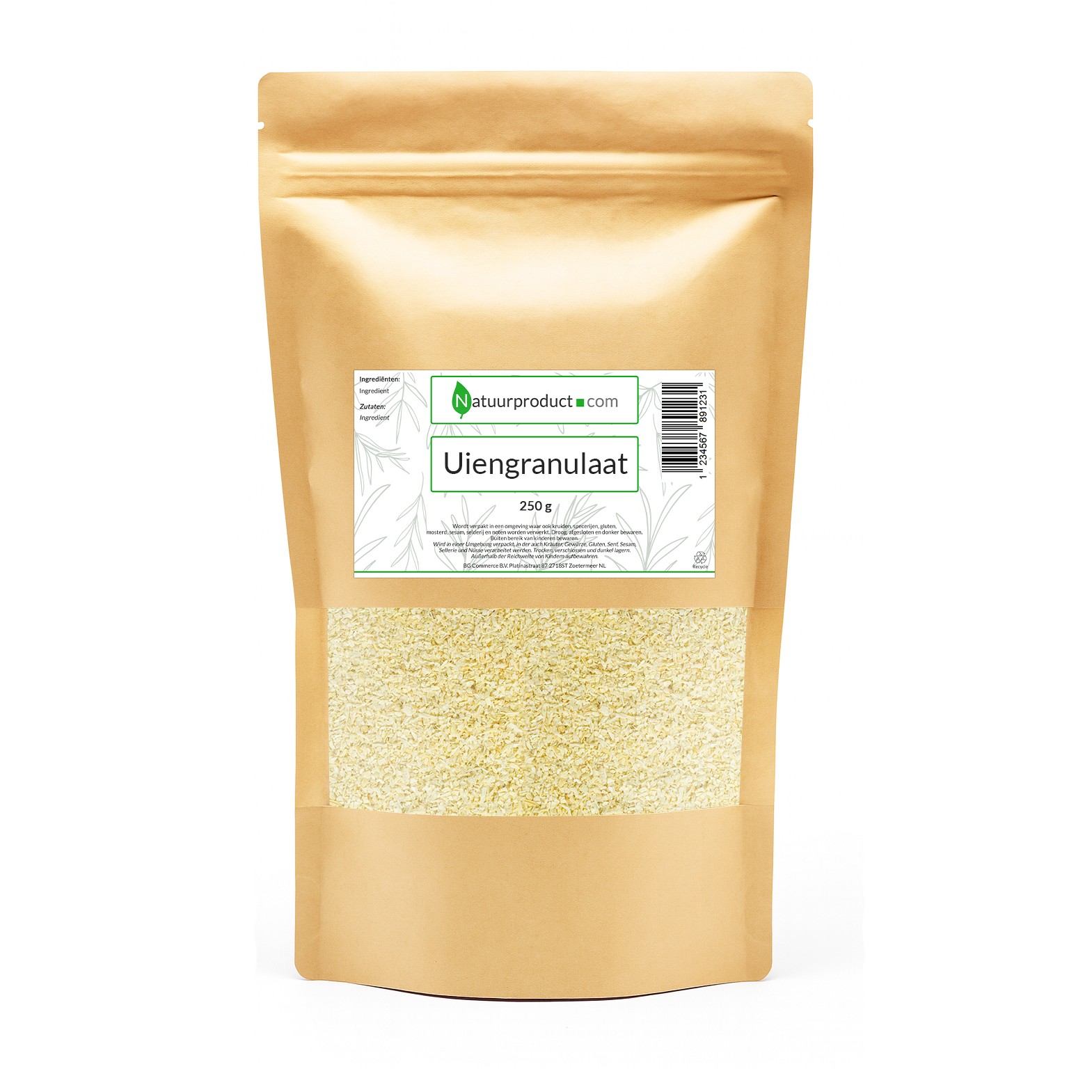 Ons smaakvolle Uiengranulaat bestaat voor 100% uit de allerbeste uien, verder helemaal niets! Deze uien worden handgeselecteerd en eerst langzaam gedroogd. Daarna worden ze pas gesneden en gegranuleerd. Een geheel natuurzuiver topproduct, fantastisch vol en puur van smaak. Deze smaakmaker is zeer breed toepasbaar en ontzettend lekker.